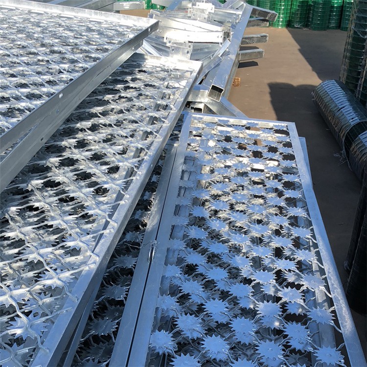 梅花刺隔離網(wǎng) 太陽(yáng)花刺鋼網(wǎng)墻主要用于監(jiān)獄、看守所的監(jiān)墻內(nèi)外。高度4米 4.5米 5米 頂部加裝蛇腹形刀刺網(wǎng)。行內(nèi)人員大家應(yīng)該不陌生,主要用相應(yīng)要求的鋼板沖壓或者激光切割成的刺片,作用是防攀爬防逃的金屬封閉屏障。監(jiān)獄梅花刺鋼網(wǎng)墻 是用氬弧焊將梅花形刺片焊接在美格網(wǎng)的節(jié)點(diǎn)上,形成刺形保護(hù),有效的防止了手握腳攀。材質(zhì)一般為不銹鋼材料,也有的采用熱鍍鋅、后熱鍍鋅或者浸塑防腐處理。梅花刺片隔離網(wǎng)主要用在監(jiān)獄隔離網(wǎng),機(jī)場(chǎng)圍界、主要用于電力配電站、邊防線、邊防哨所的高安全圍網(wǎng)。還可用于廠區(qū)、倉(cāng)庫(kù)隔離網(wǎng)、交通、通信站、垃圾場(chǎng)、小區(qū)防護(hù)、學(xué)校、工廠、農(nóng)場(chǎng)等地的圈禁防護(hù)。