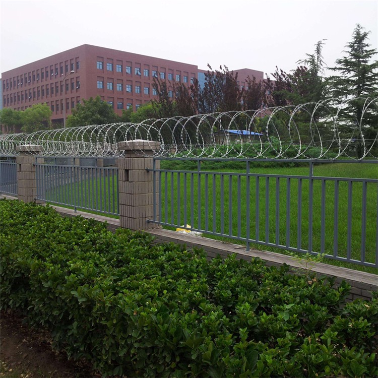 從使用環境來說,有一些學校因為建設的時間很長了,圍墻相對于現在的新式圍墻就低矮一些。我們就選擇既可以防爬又能增加圍墻高度的刀刺網。也就是我們常見的蛇形刀片刺繩。這種刀刺網的直徑有50公分、60公分,安裝以后圍墻高度會增加,既有防攀爬的效果又能增加圍墻的高度。
