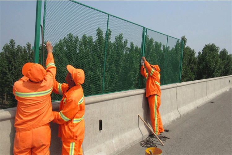 橋梁防拋網(wǎng)經(jīng)過各種表面處理后,使其產(chǎn)品性能大大增強(qiáng),使用壽命更久。表面處理主要采用:鍍鋅、浸塑、噴塑等防腐處理。使產(chǎn)品具有很好的抗老化、抗曬、耐腐蝕等特點(diǎn)。其產(chǎn)品花色多樣,美觀大方,根據(jù)顏色的調(diào)配能與當(dāng)?shù)鼐坝^達(dá)成一致。其安全性能系數(shù)高、防攀爬能力好,網(wǎng)片連接方式采用鍍鋅防盜螺絲連接,有效防止人為的破壞性拆卸,橫向四道折彎加強(qiáng)筋,使網(wǎng)面強(qiáng)度顯著增加。