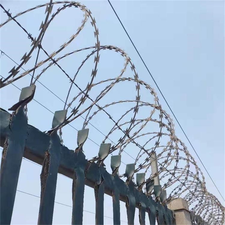 把V型支架固定在墻的上面,其間Y型支架可依據(jù)實際狀況進(jìn)行打孔,然后裝置刺網(wǎng)的時分,起到固定效果。之后,在刀刺網(wǎng)的Y型支架兩邊各拉一根鋼絲,對刺網(wǎng)進(jìn)行固定,避免左右晃。裝置刀片刺繩的時分要留意的事項也是許多的,可是要留意的是本身安全,因為刀片刺繩刀口規(guī)劃的原因遭到割傷后創(chuàng)傷欠好愈合,所以在裝置時要先保證本身的安全。一副比較厚的勞保手套是必不可少的,因為之前客戶反映過說用一般手套成果割破了兩雙,所以為了維護(hù)我們的雙手遭到不必要的損傷,必定要帶好手套避免受傷。其次刀片刺繩裝置時需求兩個人一起進(jìn)行裝置避免一 個人 裝置時因為回彈導(dǎo)致受傷。裝置時必定要慎重切不可煩躁避兔因為疏忽而遵到損傷。