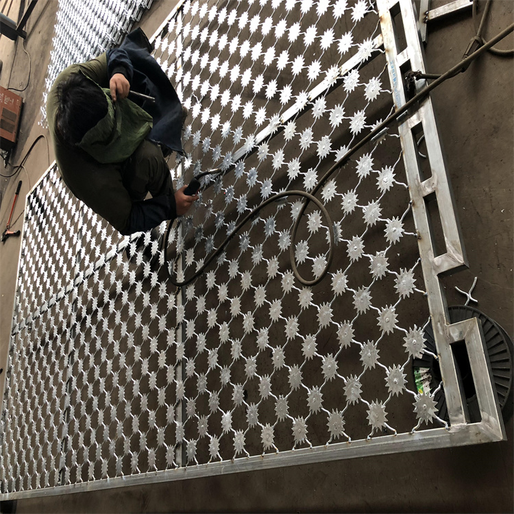 焊接型刀片刺繩網(wǎng)片是先把刀片刺繩成型之后裁成所需網(wǎng)片直條的長度經(jīng)網(wǎng)片機(jī)焊接成刀刺網(wǎng)片,孔型有長方形、正方形與菱形均可定做。材質(zhì): 芯線優(yōu)熱鍍鋅鋼絲;板材為熱鍍高鋅或者不銹鋼板材。也可以表面噴塑或者涂塑,以達(dá)到更好的防腐耐酸堿的作用,延長使用年限。孔徑大小: 5X10、10x15、10x20cm(其他網(wǎng)孔可以根據(jù)客戶需求定做)。