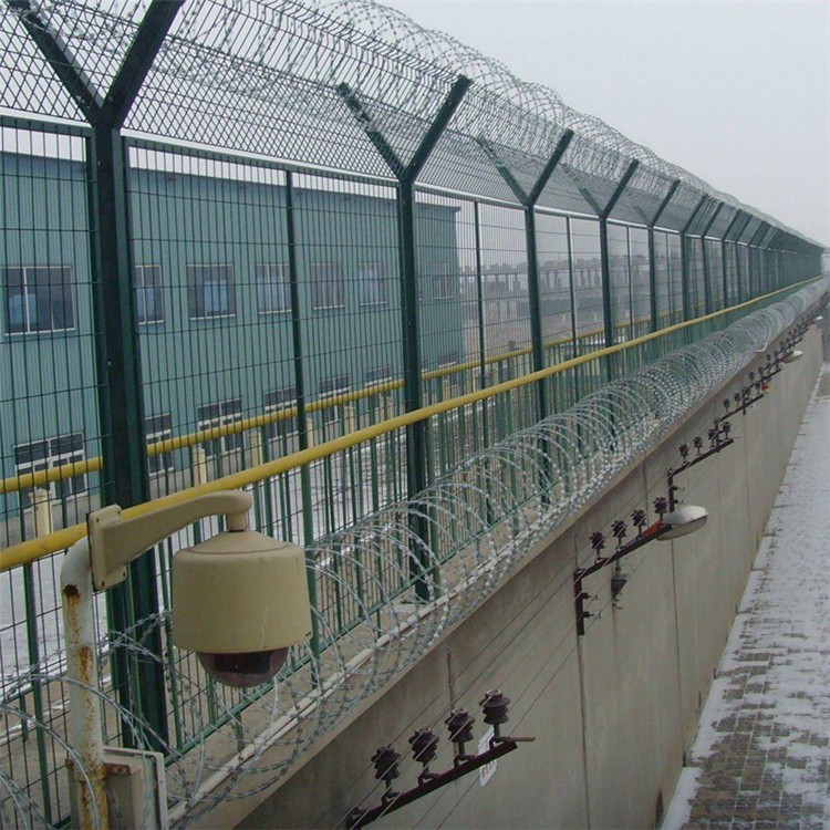 看守所內(nèi)外監(jiān)墻巡邏道隔離網(wǎng)上部安裝刀片剌網(wǎng)(剌絲滾籠) ,刀片剌網(wǎng)具有嚇阻、防翻越等效果,材質(zhì)堅硬,高強度,高張力,造型設(shè)計獨特,不宜觸摸,因而能達到極好的防護隔離效果看守所內(nèi)外監(jiān)墻巡邏道隔離網(wǎng)還具有施工簡便經(jīng)濟實用等優(yōu)點。