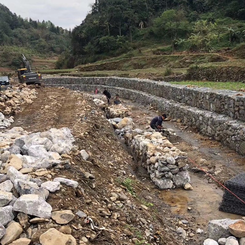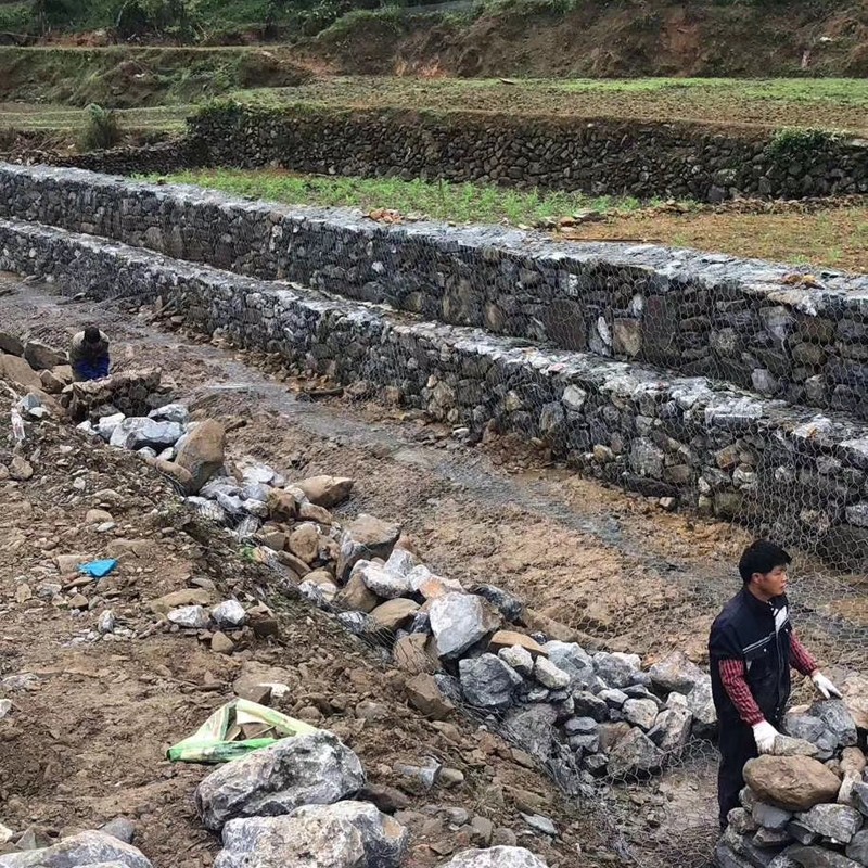 3、裝填石料時,用人工填筑石料,以保證石籠形狀不受破壞。在填料時,為保證石籠網的表面的平整度,在靠近外表面的方向先用人工將勻等的卵石有序緊密壘在鉛絲面至頂部,后填入大量剩余石料。